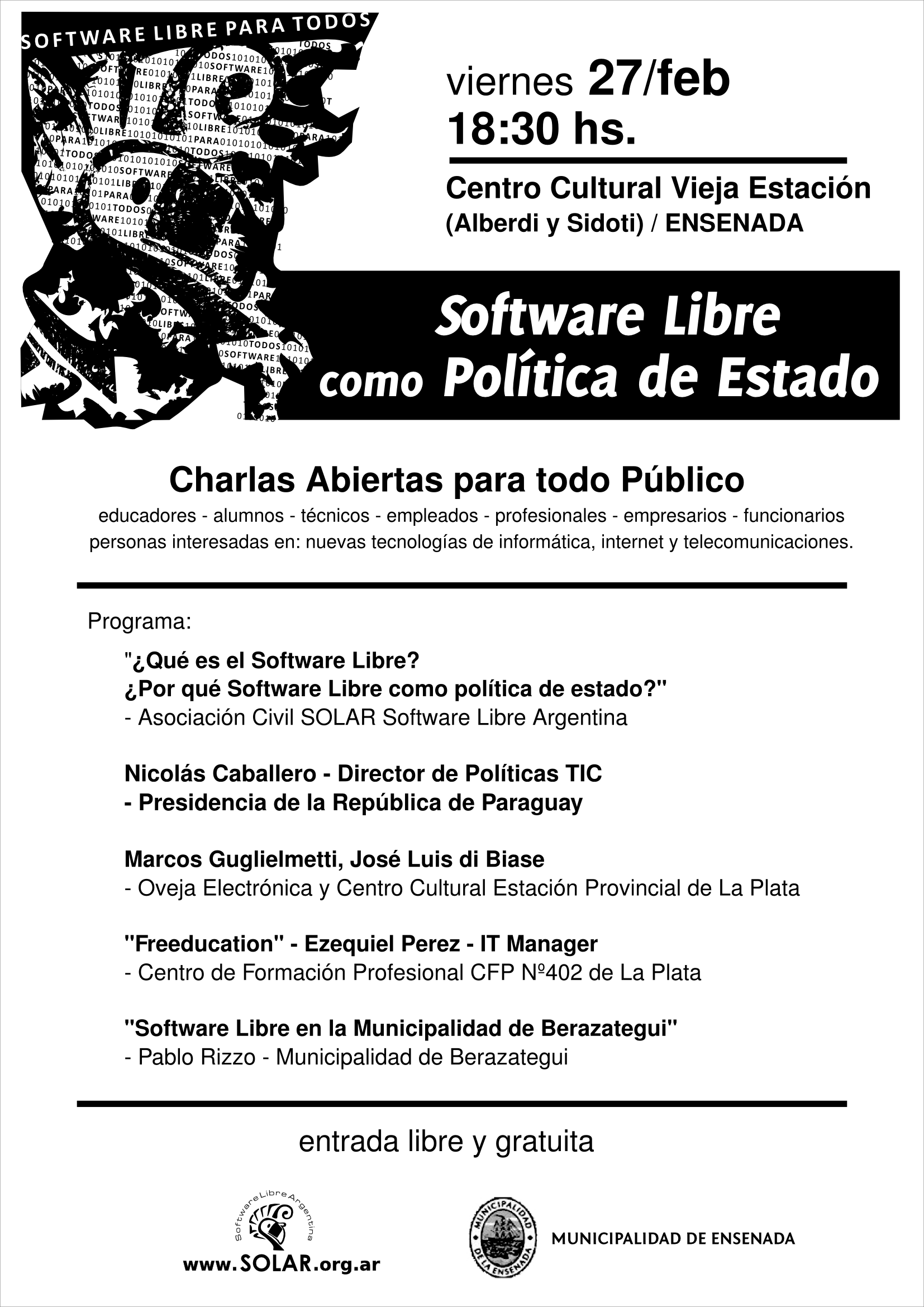 La Asociación Argentina de Software Libre SOLAR y la Municipalidad de Ensenada - pcia. de Buenos Aires - lo invitan al evento “Software Libre como Política de Estado” que se llevará a cabo el día viernes 27 de febrero a partir de las 18:30 hs. en el centro cultural Vieja Estación, ubicado en las calles Alberdi y Sidoti de la ciudad de Ensenada.